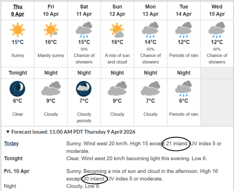 加拿大环境与气候变化部 (ECCC)预测,周四和周五紫外线指数将达到 5 级(中等),届时内陆气温将分别达到 21°C 和 20°C。