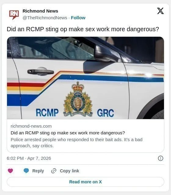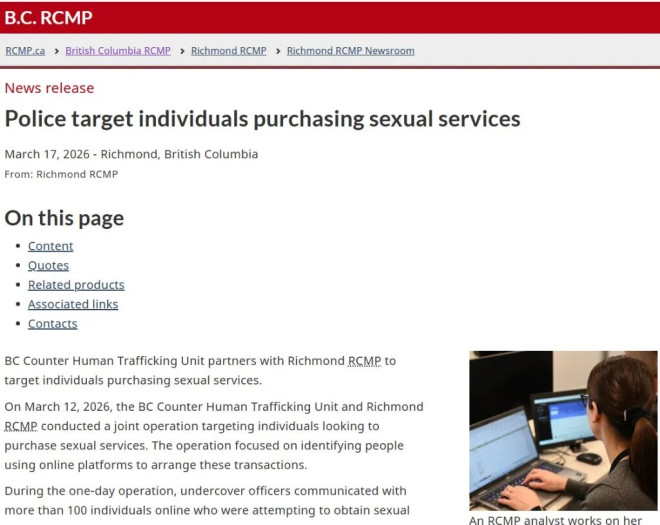 列治文RCMP在新闻稿中表示:“这些行动旨在打击性服务需求,提高公众对性交易相关伤害的认识……正是消费需求推动了人口性贩运,创造了剥削脆弱群体的环境”。