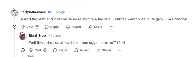 楼主进一步表示,“问了店员,好像就是因为卡尔加里一个 Burnbrae 仓库发生火灾,什么时候恢复还不知道。”