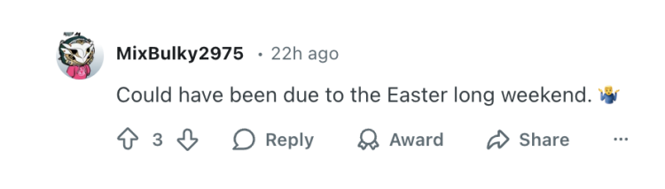 “都是因为复活节长周末的缘故”