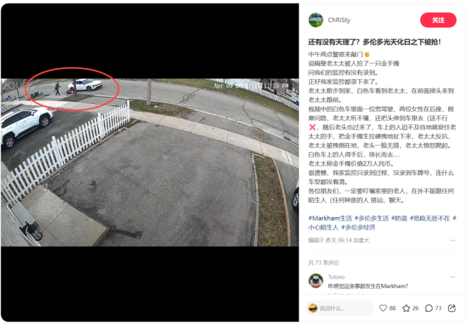 据万锦居民@ChRISty发帖讲述,周四下午2点左右,警方突然到她家敲门,说隔壁老太太刚刚被人抢了一只金手镯,想问问监控有没有拍到什么。