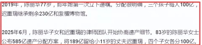 据说,陈丽华在2019年对身后事做过安排,且里面分配很明确,她的三个孩子每人一百亿,其余的便由迟重瑞继承。
