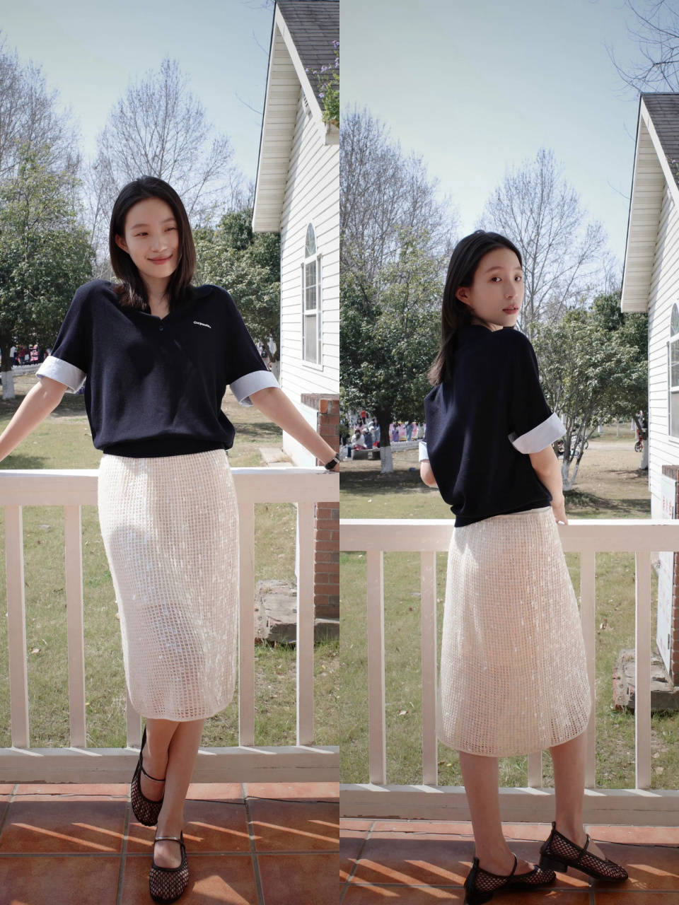 年龄不同,气质不同,选择的穿衣风格自然有点差异。也可以选择藏蓝色的 polo 衫,搭配上一条亮片的白色直筒半裙,脚踩一双黑色的网格低跟单鞋,这样的穿搭既沉稳又时尚。