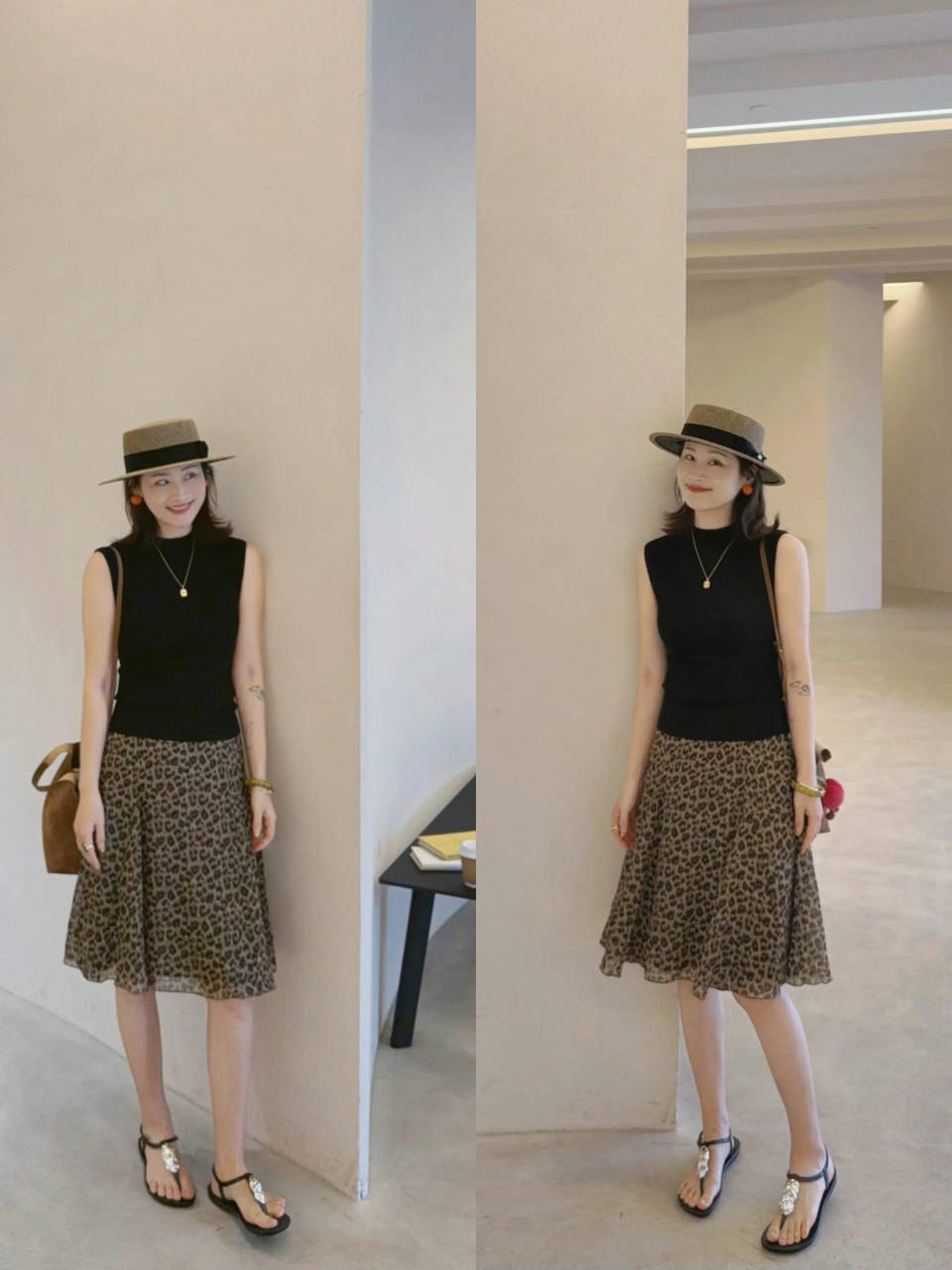 也可选择一件黑色的无袖针织上衣,搭配上豹纹的半身裙,脚踩一双平底凉鞋,戴上一顶草帽,氛围感直接拉满。这样的繁简结合穿搭技巧,温柔干净又多了几分松弛文艺气质。