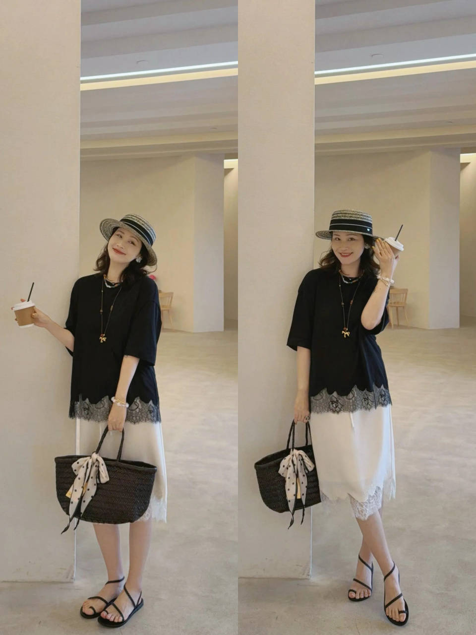 若是比较喜欢沉稳的打扮风格,直接选择一件拼接的黑色短袖上衣,搭配上白色的直筒半裙,脚踩一双黑色凉鞋,这样的黑白色调穿搭,简简单单但不失高级气质。