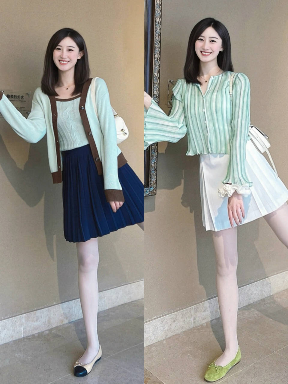 若是咱们的身材比例比较好的情况下,确实可以采用下衣失踪穿法,用一件软糯贴肤的浅绿色针织开衫,内搭同色系针织打底衫和一条藏蓝色的压褶 A 字短裙组合,既能呈现大长腿优势,抢眼又吸睛。
