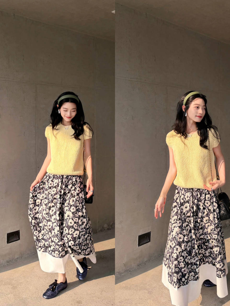 或是采用繁简结合的穿搭方式,用浅鹅黄色的短袖上衣搭配上一条印花的半身裙,这样的色调组合让造型更精致,也能增加你春日的氛围气息和时尚感。