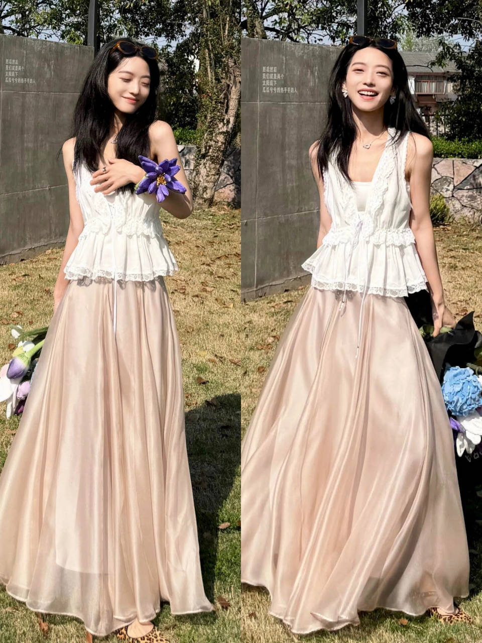 例如上面用一件白色的上衣配上粉色 A 字伞裙,脚踩一双白色帆布鞋,这样的穿搭少女感扑面而来。