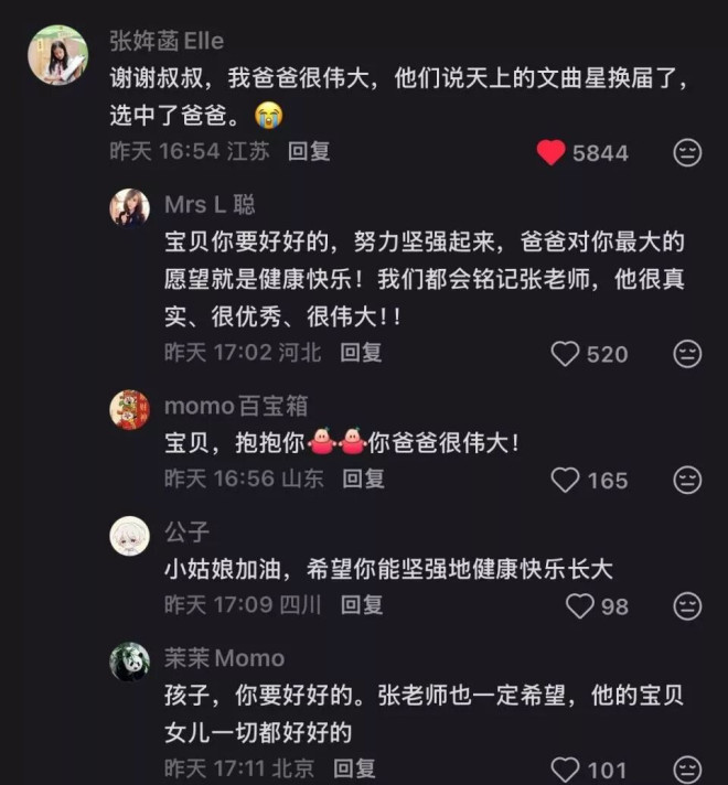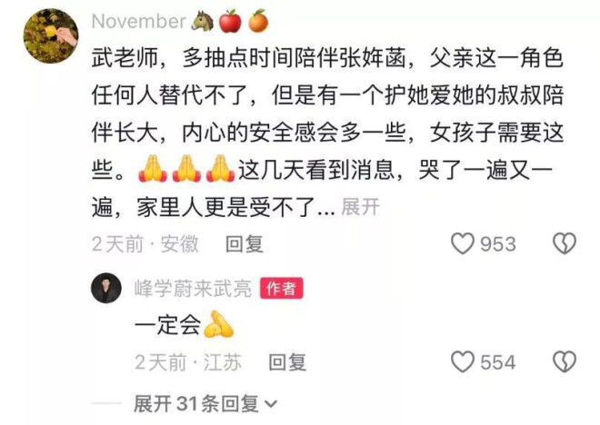 在父亲去世后的数日,张姩菡明显也在关注网络上对父亲的缅怀。