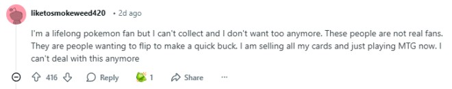 有网友自称一直都是宝可梦的忠实粉丝:“我现在既不能收集卡牌,也不想再收集了。这些人根本不是真正的粉丝,他们只是想倒卖卡牌赚快钱。我正在卖掉我所有的卡牌...我真的受够了。”