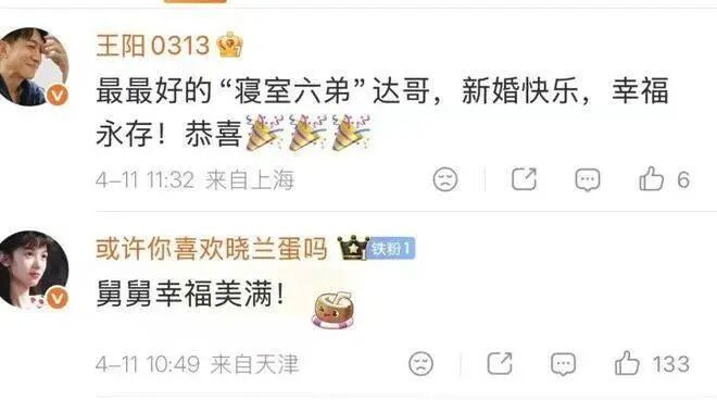 大学同寝室的王阳,喊他“寝室六弟”,真心道贺。