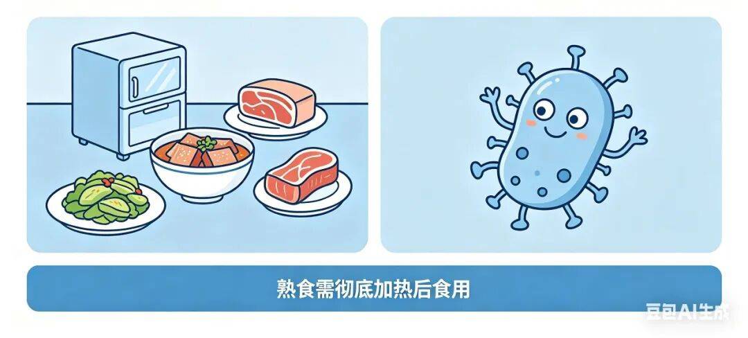 1.彻底加热:所有从冰箱取出的熟食、剩菜,食用前务必彻底加热至中心温度70℃以上,并确保热气腾腾。