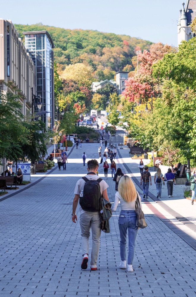 秋日晴朗的一天,一对年轻情侣手牵手走在舍布鲁克大学宽阔的步行街上,街上人来人往,充满活力。