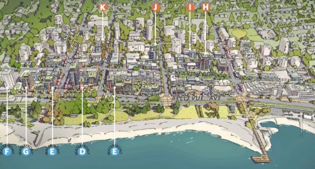 “低层核心”区域:涵盖规划区的大部分,包括Marine整条街道、Bellevue的中心部分以及Clyde的部分路段。该区域将有机会新建底层商业,并设置退台的上层空间。