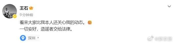 随后,王石微博发声:“看来大家比我本人还关心我的动态。一切安好,造谣者交给法律。”