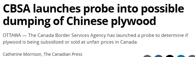 加拿大边境服务局(CBSA)已启动调查,评估中国胶合板在加拿大市场是否受到补贴或以不公平价格销售。