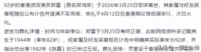 但是对于他的年龄,外界却一直存疑,网络上很多资料显示他是82岁,但家属和好友在讣告中却说明他是92岁。