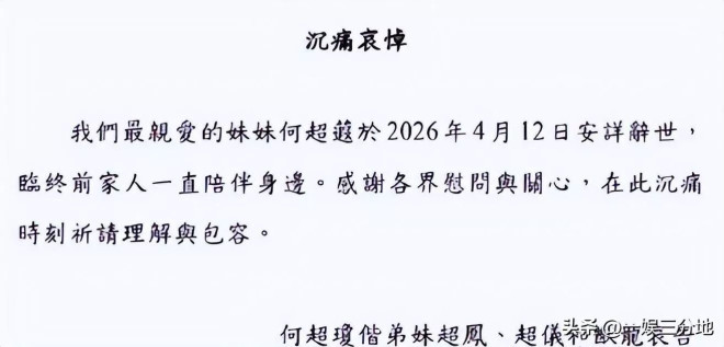 下午时分,信德集团发布讣告,称何超蕸已于4月12日安详离世,临终前家人一直陪伴在她身旁,由何超琼携弟弟妹妹们一起哀告。