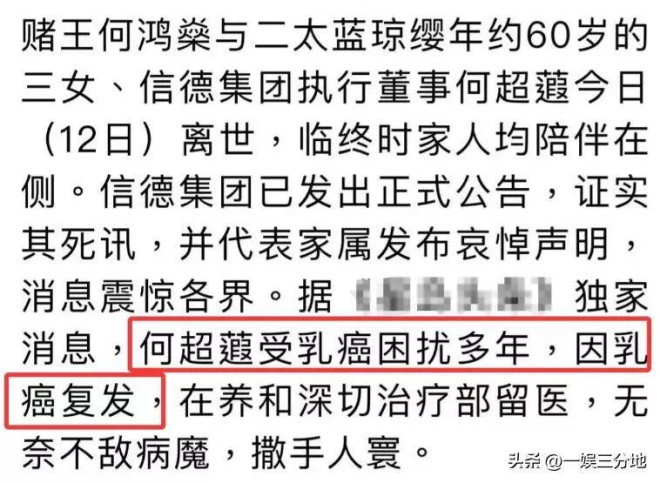 随后,港媒也证实了这一消息,说何超蕸早已确诊了乳腺癌,一直默默抗癌,即使家族拥有顶级的医疗资源,但还是难抵癌症复发。