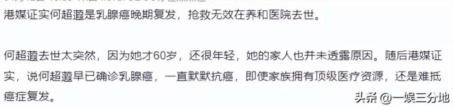 不过,昨天有原因爆出,何超蕸是因为受乳腺癌困扰多年,因为癌症复发,在就医时无奈不敌病魔,撒手人寰。