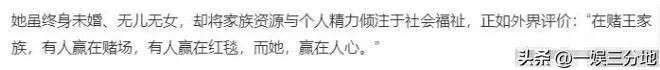 外界对她的评价也很高,“在赌王家族,有人赢在赌场,有人赢在红毯,而她赢在人心”,这和她坚持做慈善的初心有很大的关系。