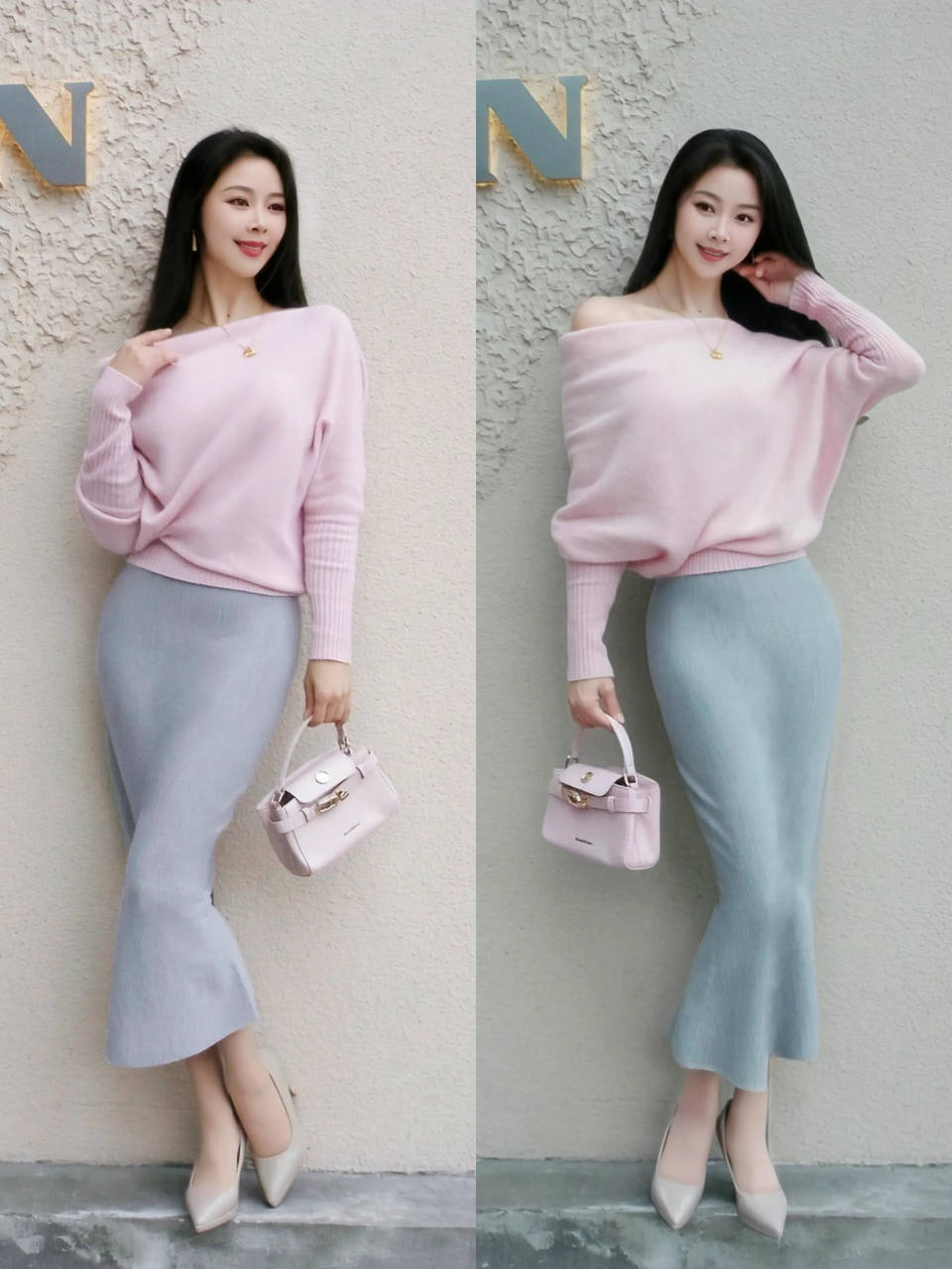当咱们选择的是一件粉色的针织上衣搭配上一条比较有光泽感的鱼尾半身裙时,这样的穿衣造型想要呈现出沉稳优雅又显年轻的轻熟风造型。