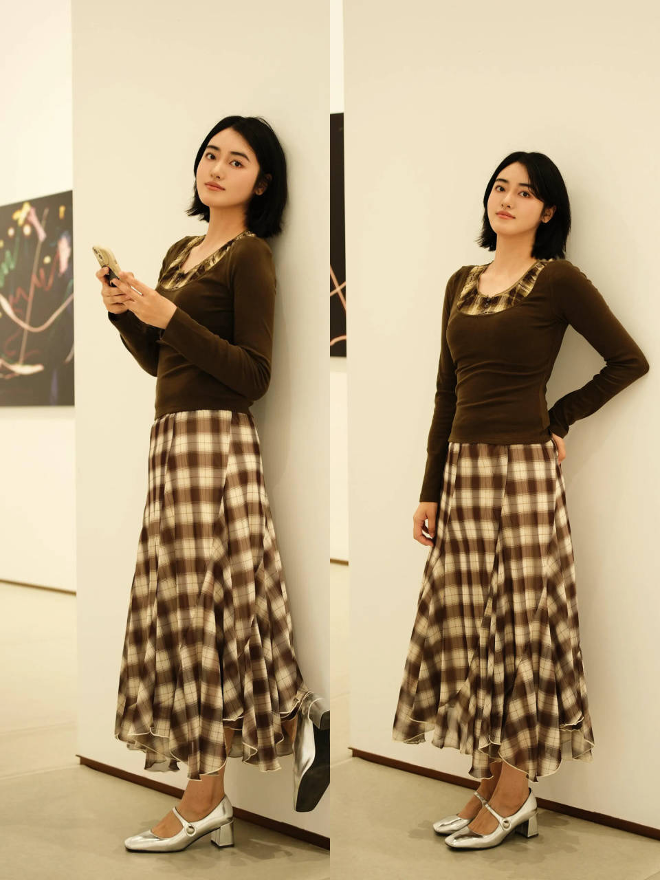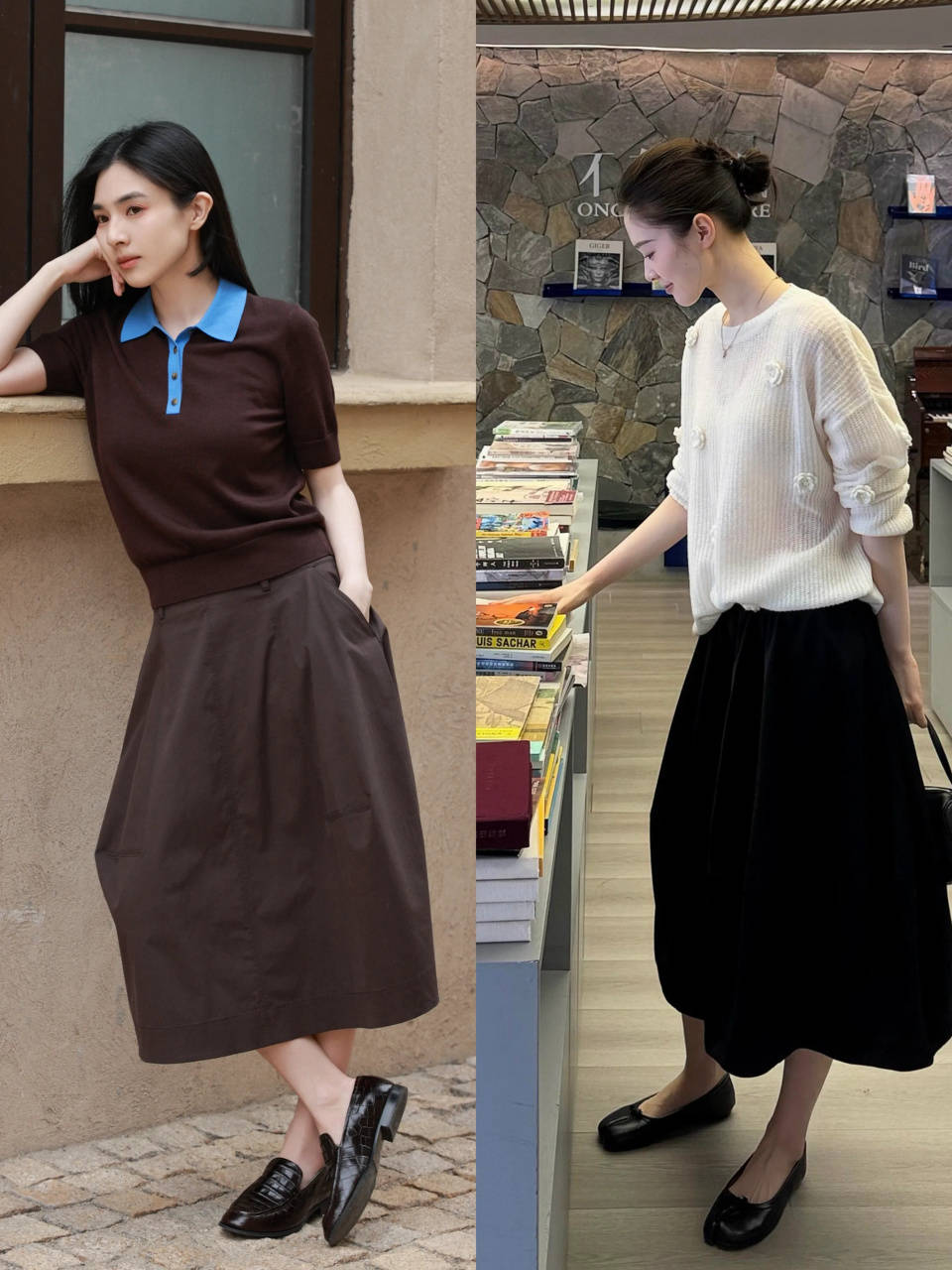 若是咱们选择的是一件棕色的针织 polo 衫,搭配上棕色半裙,可选一双黑色的皮鞋或是乐福鞋来组合,更显气质。