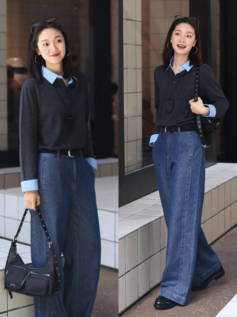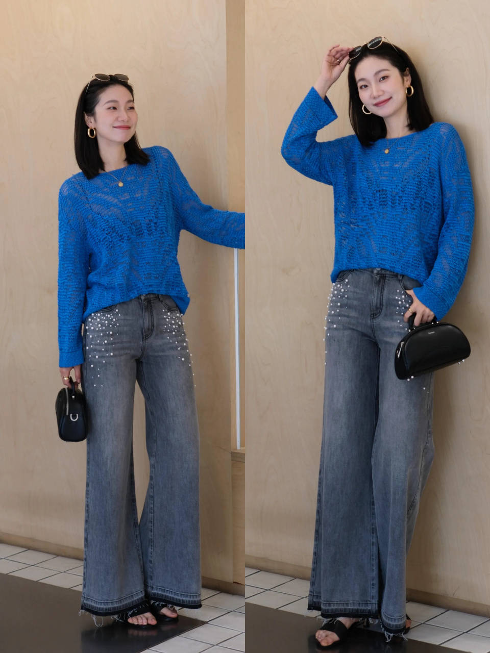 Tips②:蓝色镂空针织衫+灰色牛仔直筒阔腿裤