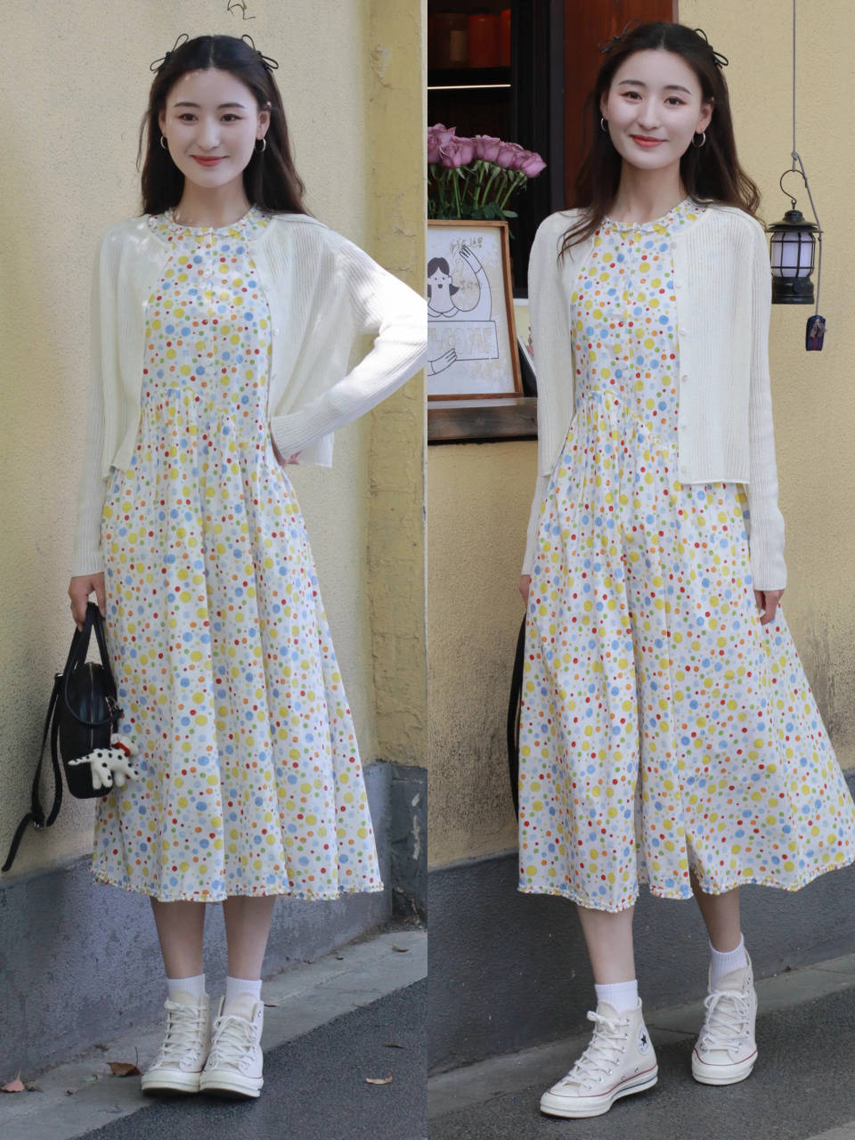 若是偏爱仙气飘飘的少女气息,可以直接选择一件白色的针织开衫,搭配上一条波点的连衣裙,脚踩一双帆布鞋,增强元气少女气息,可盐可甜,让你轻松拿捏。