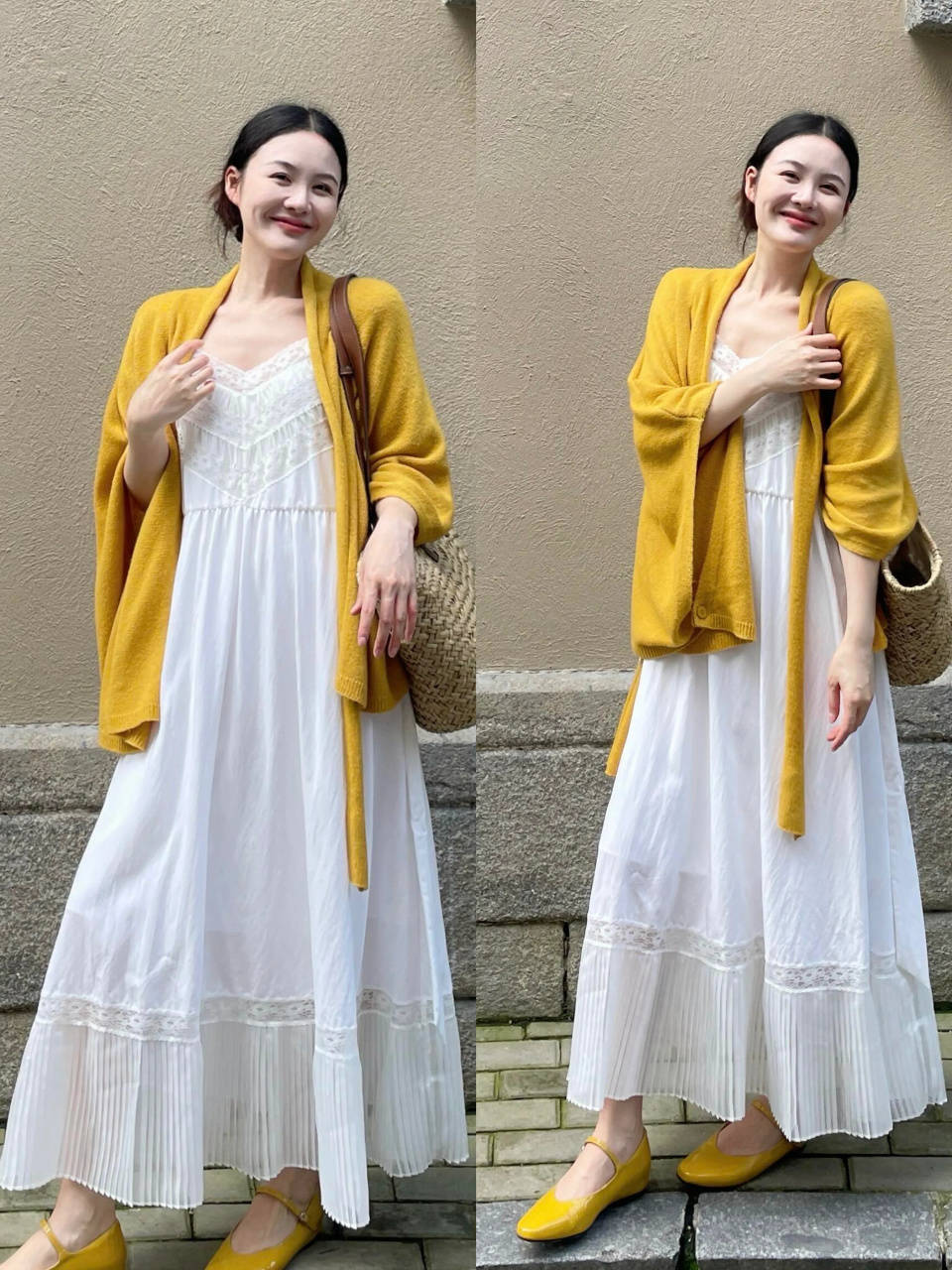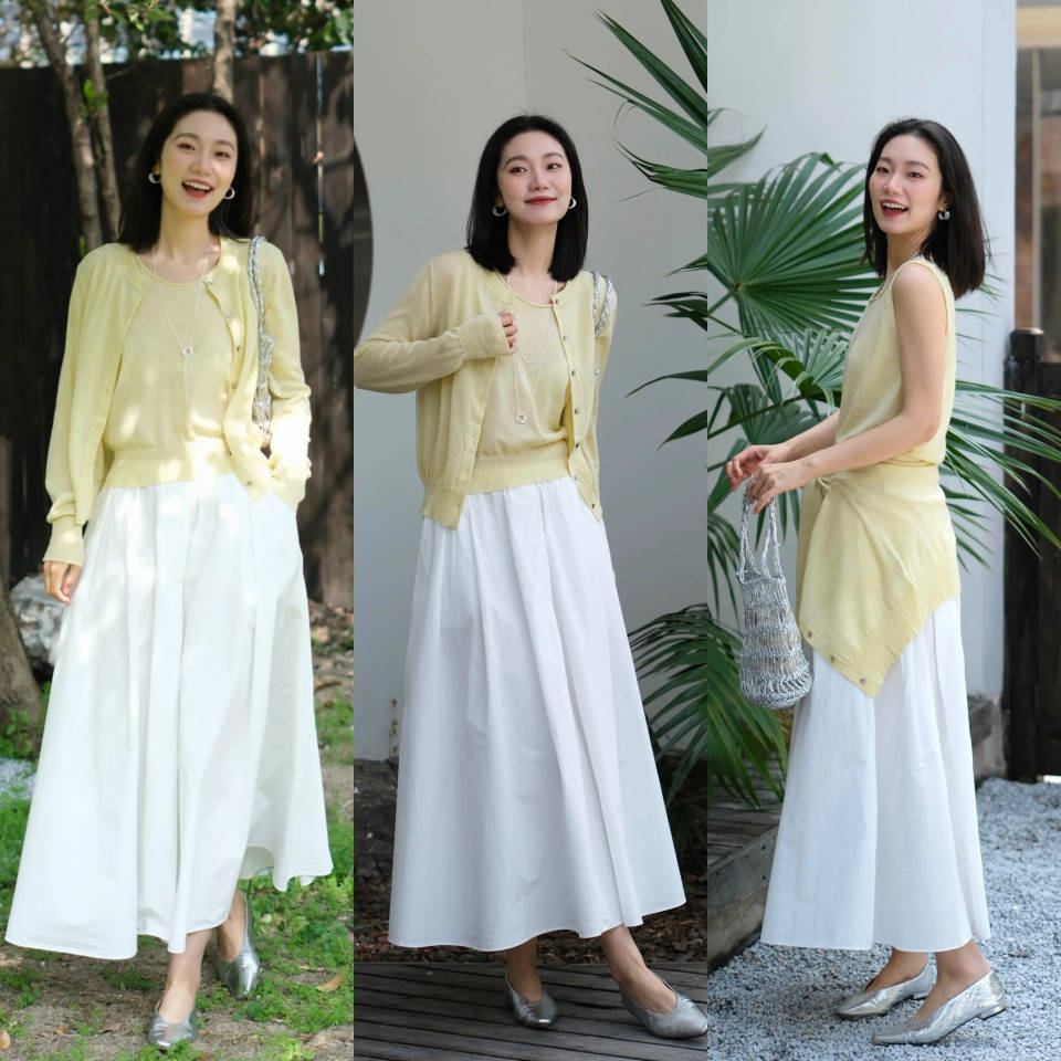 part②:浅鹅黄色针织开衫+白色伞裙,元气满满