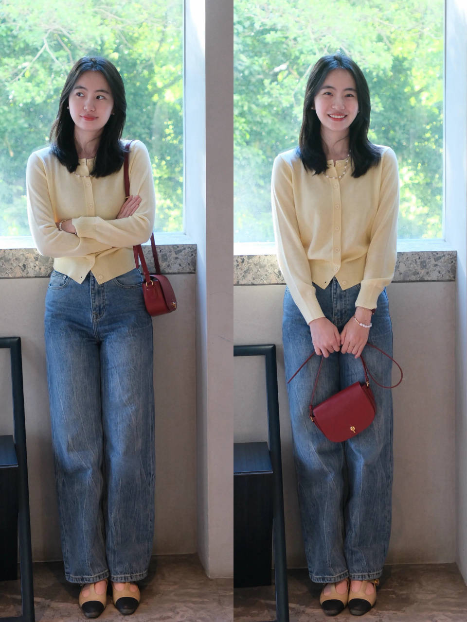偏爱日常耐看的造型,可选择浅鹅黄色针织开衫,搭配上蓝色的牛仔直筒裤,脚踩一双黑色与卡其色拼接的玛丽珍鞋,配色干净简约,适配大多数人,不挑身材,不挑场景,轻松穿出松弛休闲感造型。