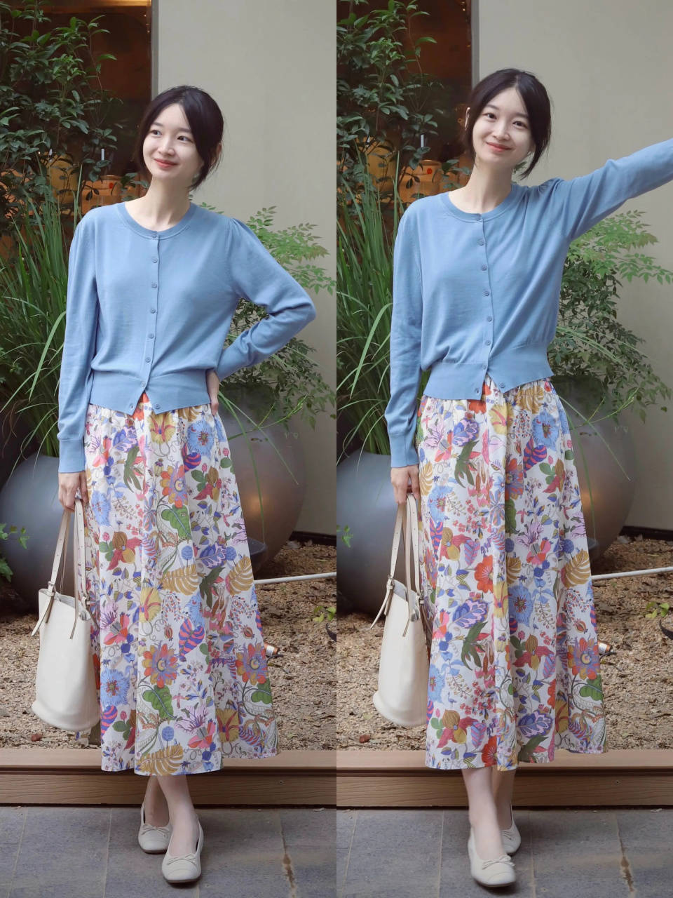 例如上面用一件蓝色的针织开衫搭配上一条印花的散装半裙,脚踩一双玛丽珍鞋,这样的穿衣打扮轻松打破沉闷与枯燥,同时解决配色单调问题。