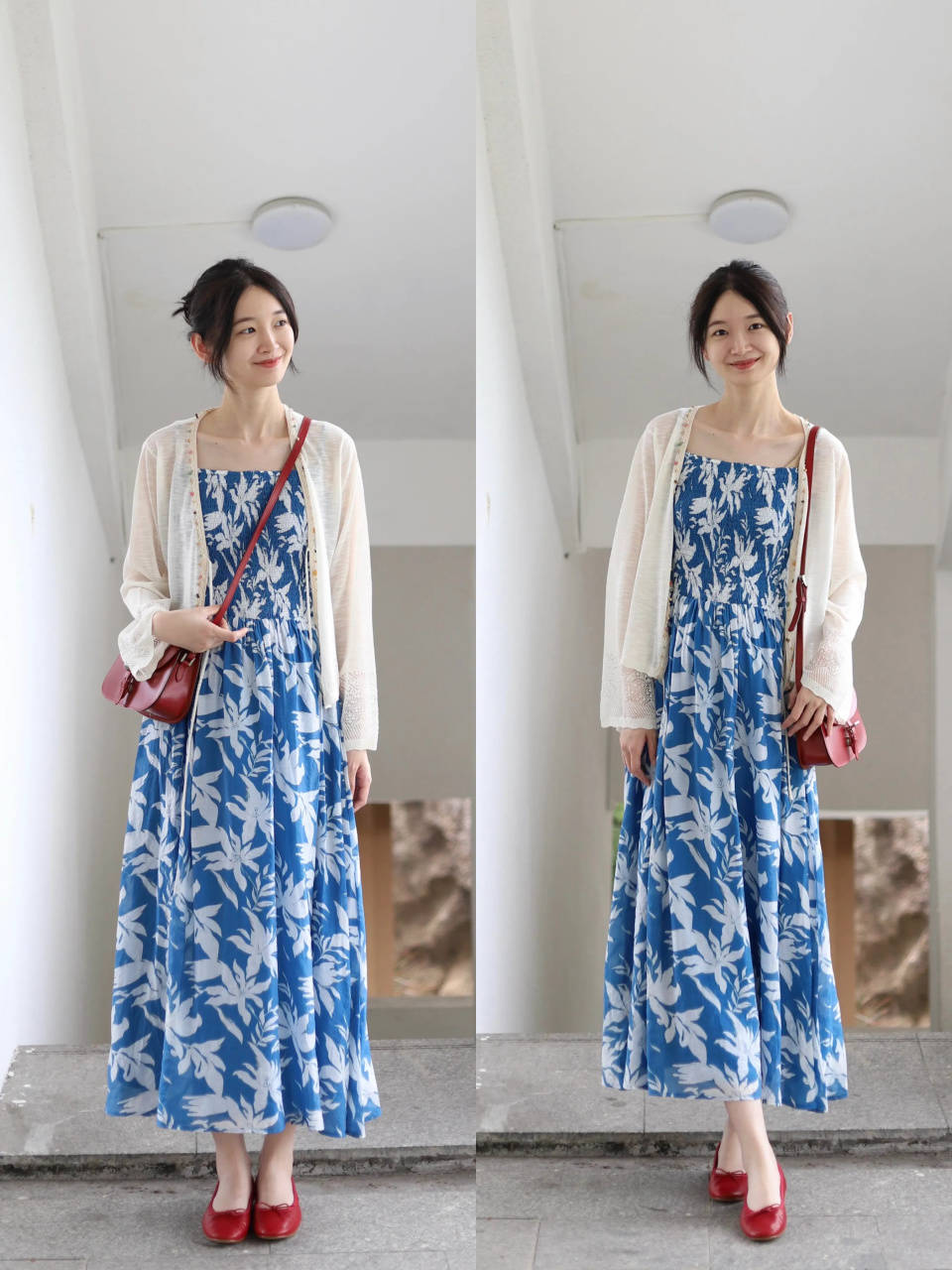 咱们还可以选择一件短款的白色针织开衫,搭配上一条印花的吊带连衣裙,脚踩红色玛丽珍鞋,外短内长的搭配方案,能使得我们的身材比例变得更协调。显高又显瘦。
