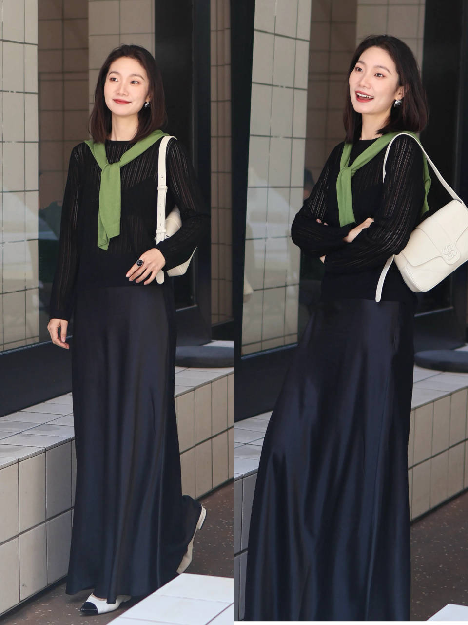 若想让自己的造型更显贵的情况下,我们在衣服的面料和款式上可以下点功夫,例如上面用真丝面料的垂坠感黑色直筒半裙搭配上半透明的黑色针织上衣,显贵又略带点小性感,拿捏得恰到好处。