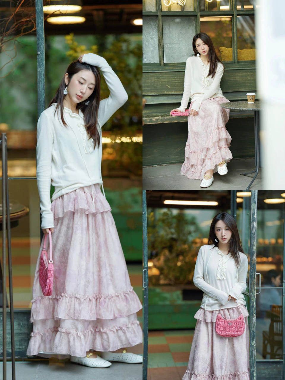 一双鞋子也能改变整体的风格走向,当你穿上一条粉色的蛋糕半裙和一件针织小众上衣,这时候咱们可以选择和上衣同色彩的白色平底单鞋来组合搭配,这样的穿搭既温柔又不失女人味。