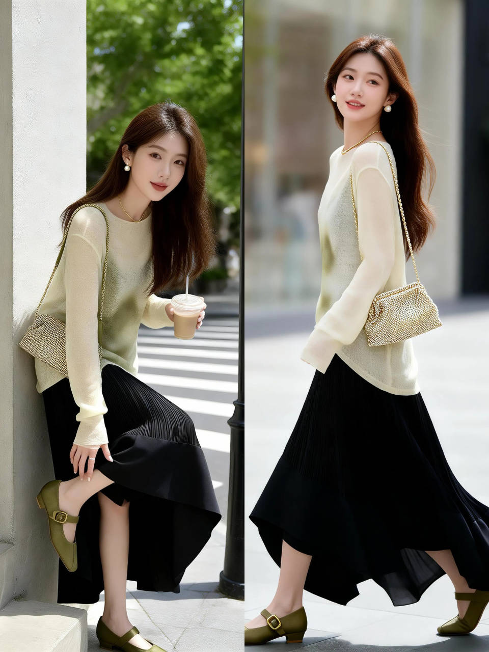 part①:透明太黑色针织衫搭配真丝面料半裙,高贵典雅