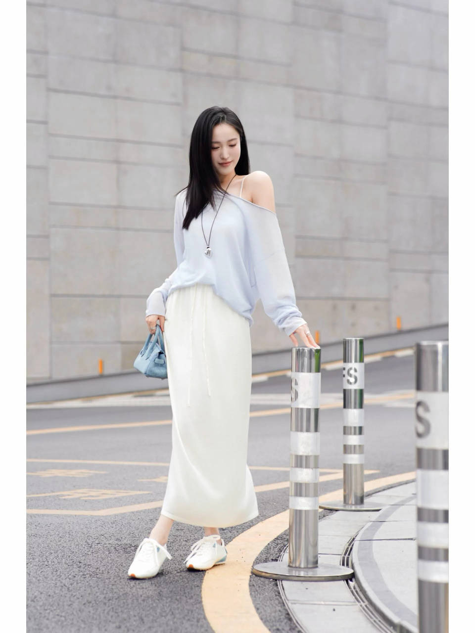 若是偏爱温柔优雅感,可选一件同样是一字肩的淡蓝色上衣,配上一条白色的垂坠感直筒半身裙,脚踩一双白色的运动鞋,不费力不费时,让你轻松拿捏春日的小性感造型。