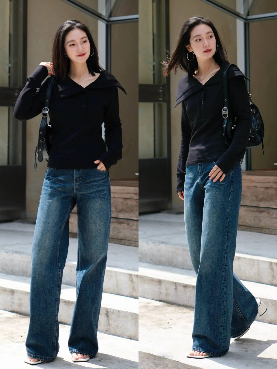 下半身选择蓝色的牛仔直筒阔腿裤和黑色的皮鞋,自带简约的浪漫气息,同时更容易展现职场女性的干练气质。