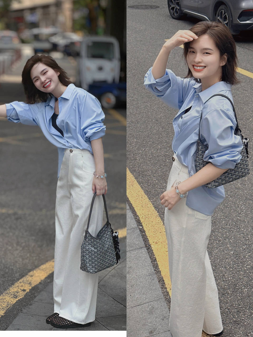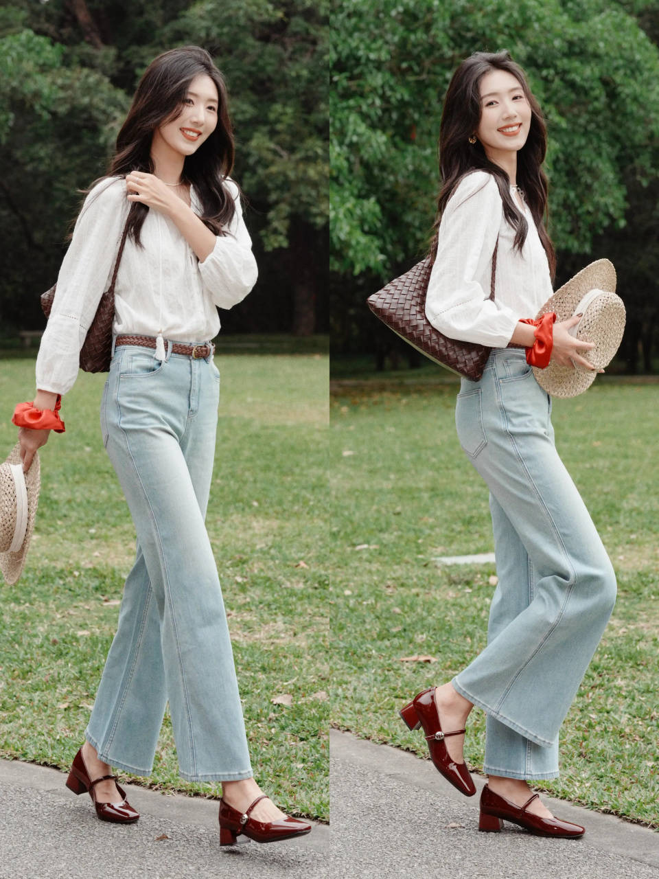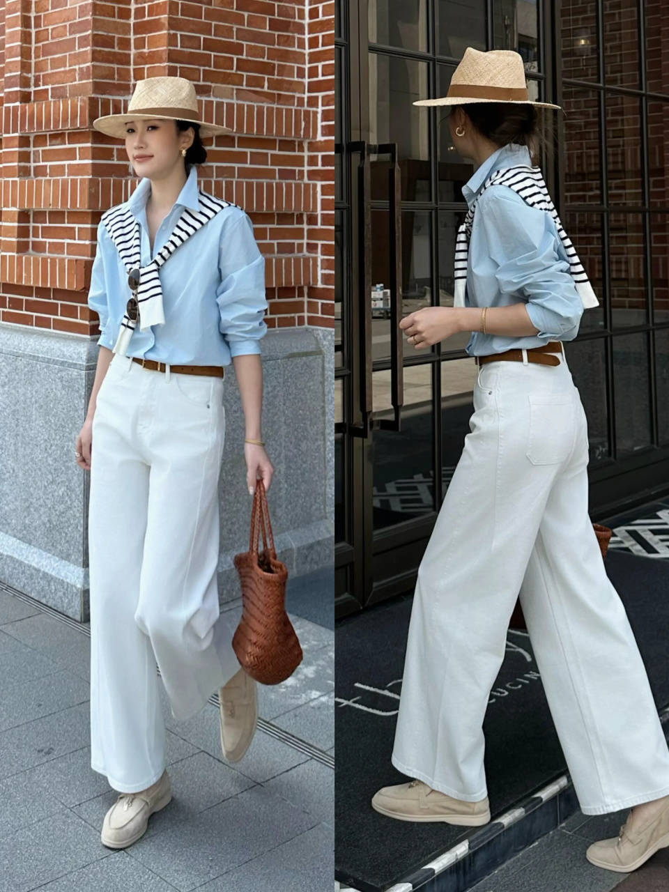 若是喜欢更清爽的穿衣风格,可选一件白色的牛仔直筒阔腿裤,配上一件蓝色的衬衫上衣,蓝白色彩穿搭温柔雅致,不管是通勤、上班、约会、逛街。都完美适配。