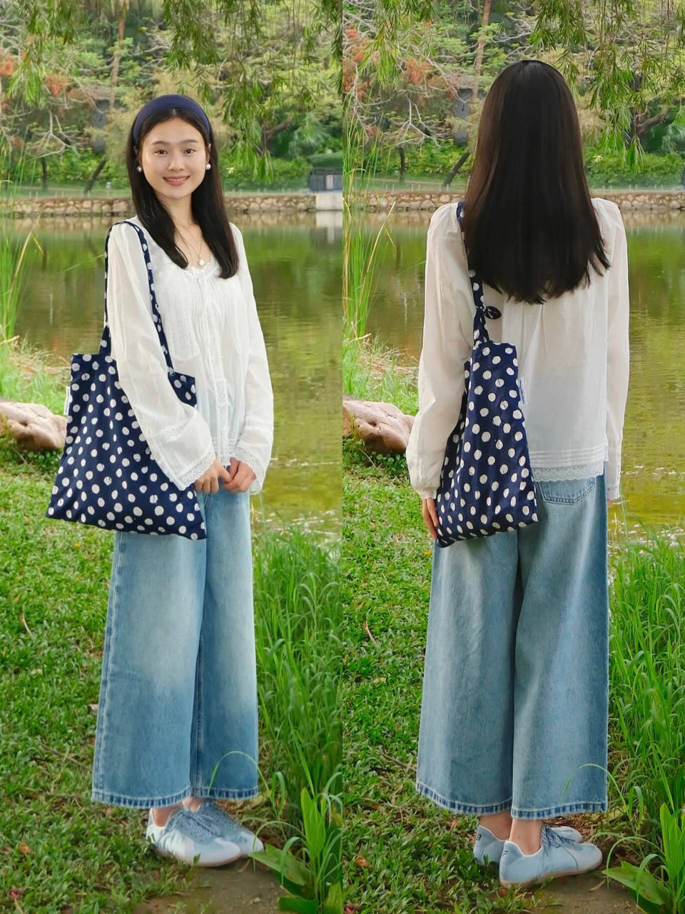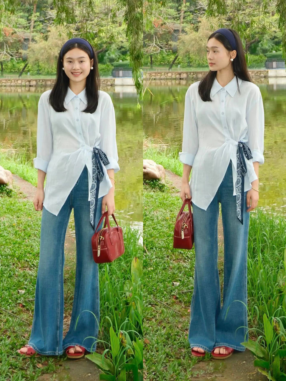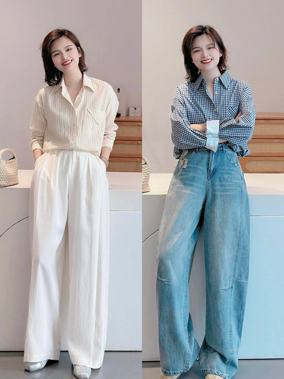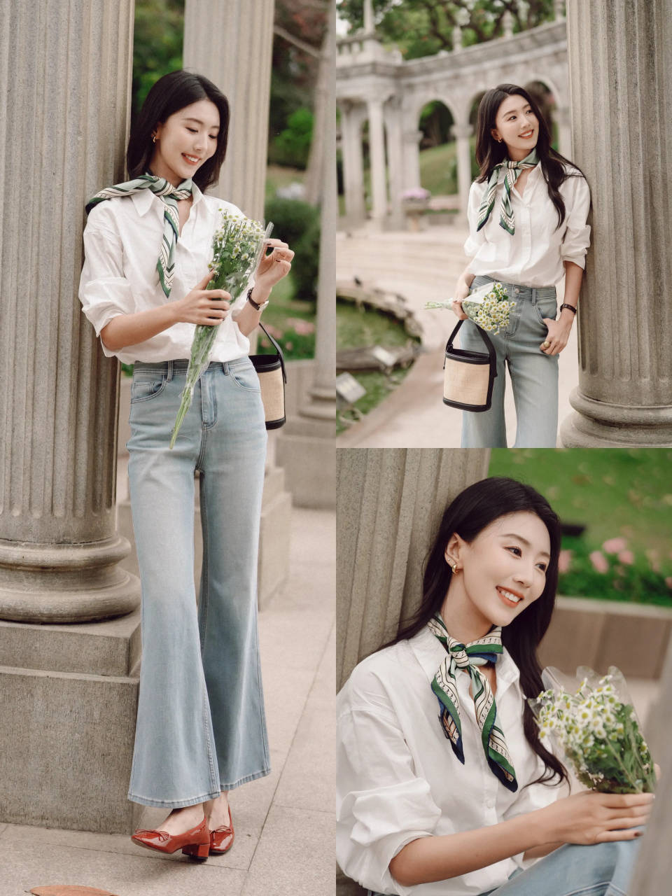 若是喜欢更清爽的穿衣风格,可选一件白色的牛仔直筒阔腿裤,配上一件蓝色的衬衫上衣,蓝白色彩穿搭温柔雅致,不管是通勤、上班、约会、逛街。都完美适配。