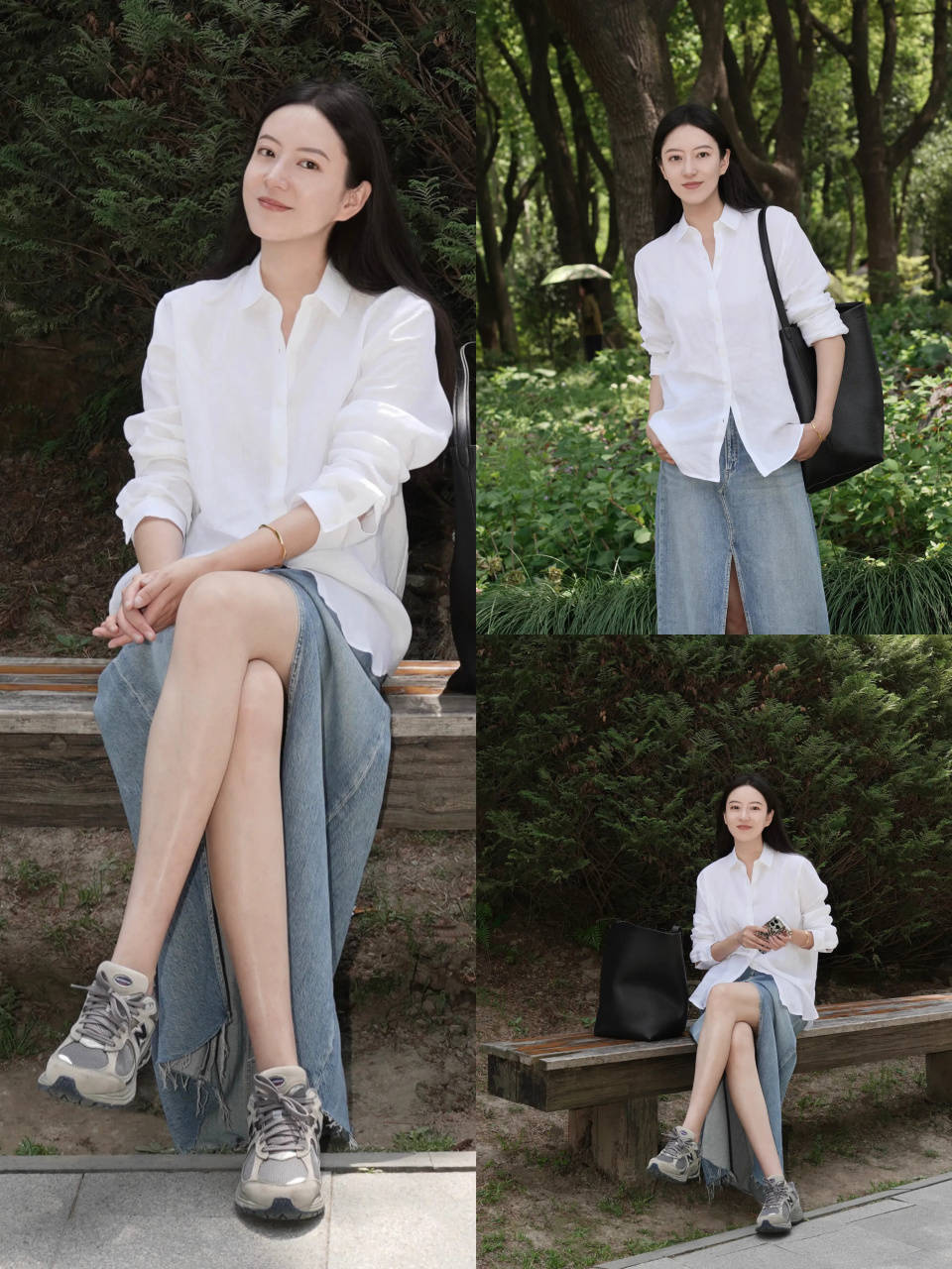 当咱们穿上一条牛仔直筒开叉半裙和一件白色的衬衫上衣,同样也可以让整体穿搭偏休闲运动风,直接选择灰色的老爹鞋来搭配,就能呈现利落精致造型。