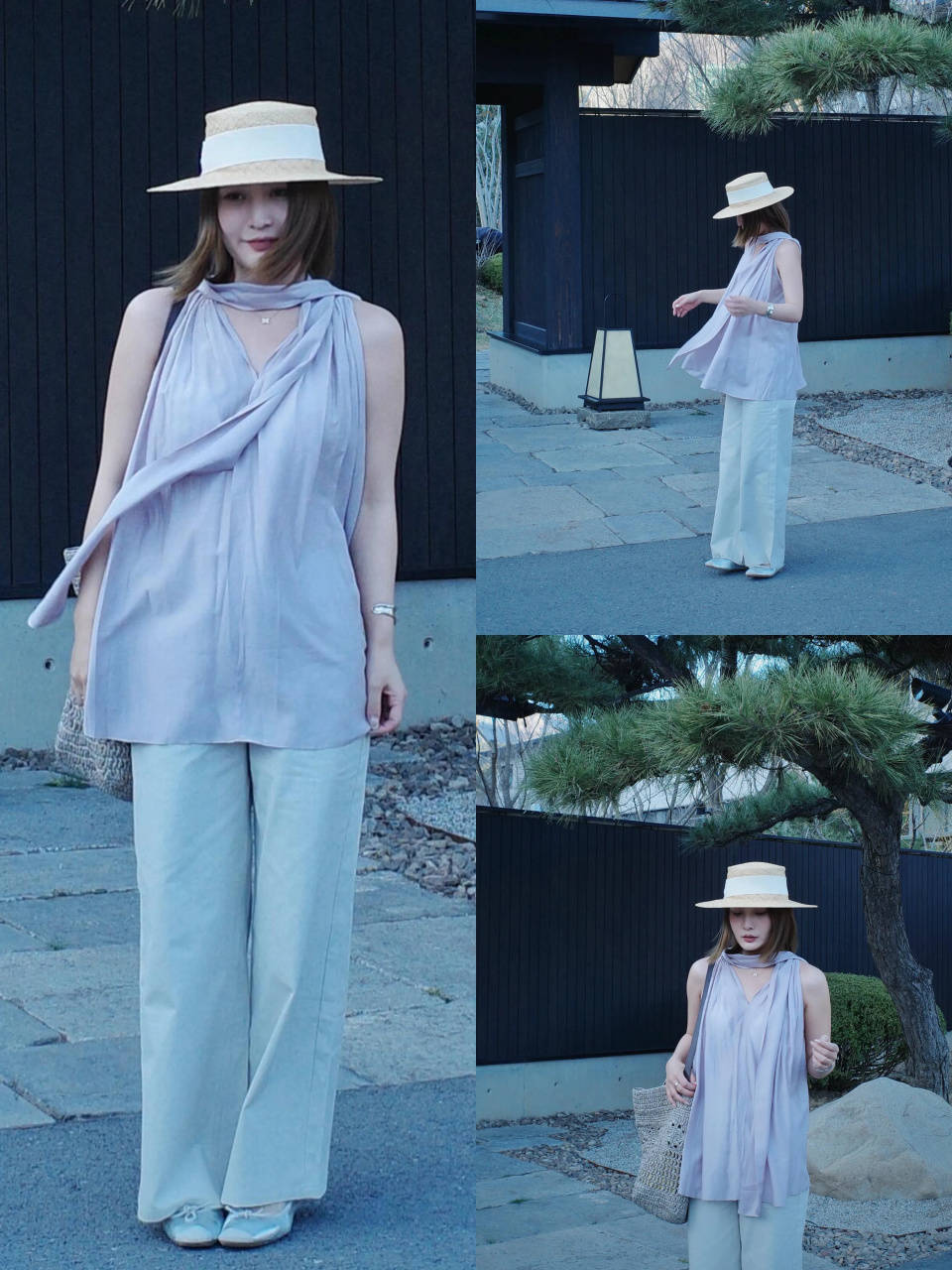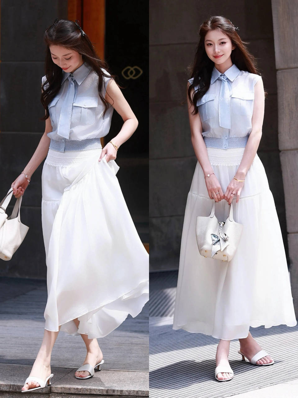 颜色的不同也会改变整体的气质,偏爱清爽优雅的气质风格,选择雾霾蓝的无袖衬衫上衣搭配上白色的薄纱伞裙,脚踩一双白色的低跟凉鞋,一整套穿衣配色温柔又有气场,又自带职场女性的从容与干练。