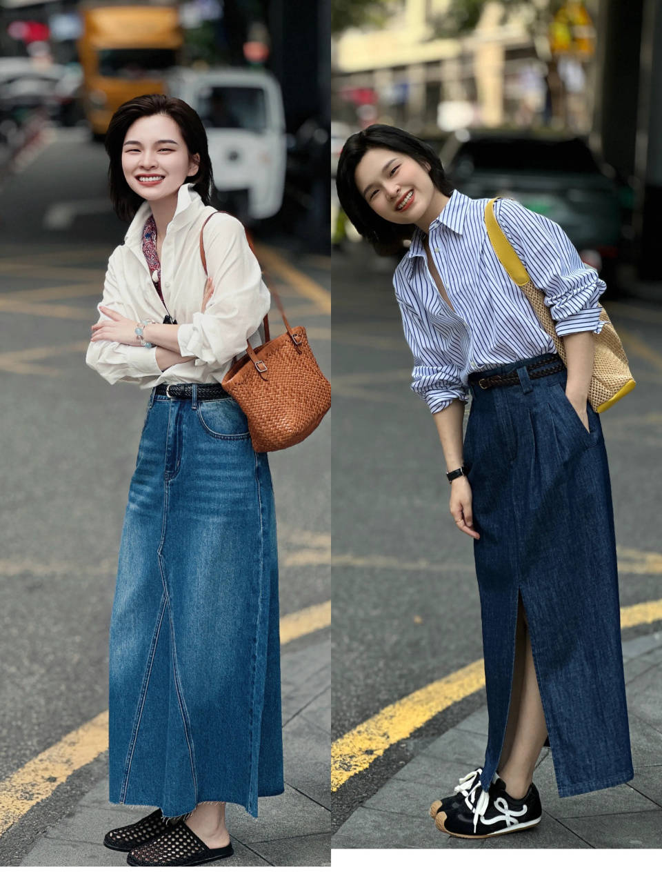 牛仔半身裙配上一件小众的白色衬衫上衣,能够穿去上班,日常出街。约会,旅行都显得舒适上镜。