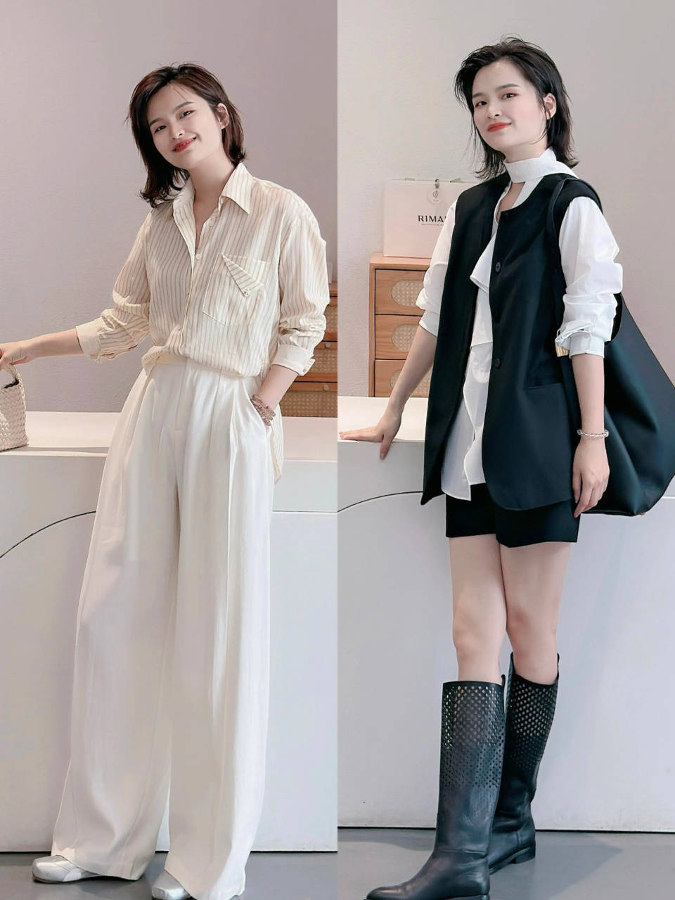 穿衣从不必盲从潮流,合己身,衬气质便是最好的风格,例如上面用黑色无袖马甲叠搭白衬衫,配百慕大短裤与黑色中筒靴,又飒又美,利落气场自成一派。