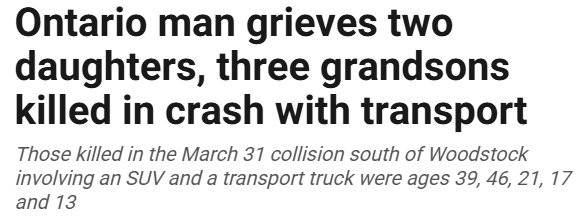 安省省警(OPP)表示,事故发生在3月31日下午3点左右,地点是Norwich Township内、Woodstock以南的59号公路与Quaker Street交叉口。当时一辆SUV与一辆运输卡车发生碰撞。