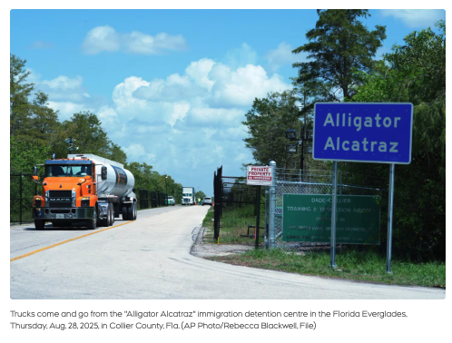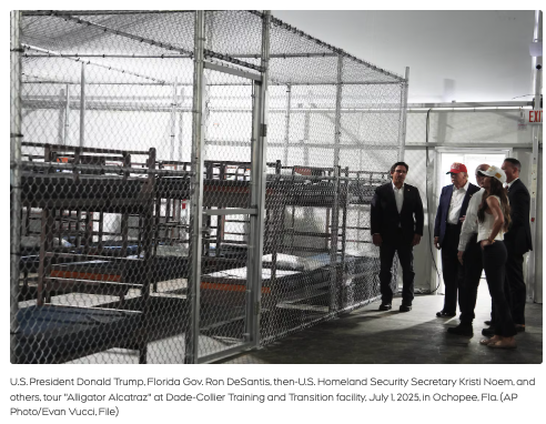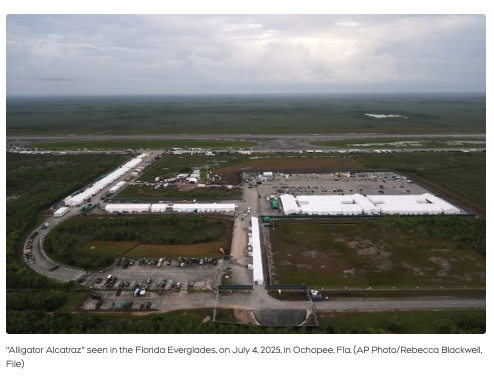 所谓“鳄鱼恶魔岛”,是一座可容纳3000多人的大型移民拘留设施。人权组织和美国民主党议员将其称为“集中营”,已有移民对美国国土安全部和ICE提起诉讼,指控其中存在虐待行为;环保组织也在推动联邦法院关闭该设施。
