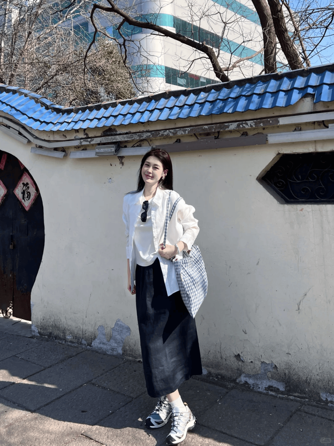 白衬衫叠穿白T恤,清爽又有层次感,下搭黑色高腰半身裙,利落又显高。露出纤细脚踝,视觉上更显轻盈,配上一双灰白色运动鞋,瞬间弱化正式感,多了几分随性休闲。整套黑白穿搭简约高级,不挑身材还藏肉,初夏出门舒适又时髦,轻松穿出慵懒气质。