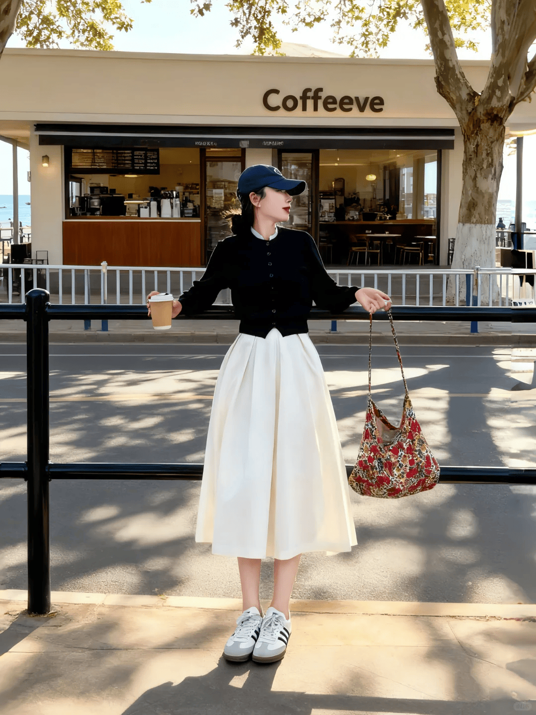 黑色短款针织衫搭配白色高腰伞裙,利落又显比例,高腰伞裙蓬松遮肉,轻松打造温柔氛围感。脚踩一双白色德训鞋,舒适随性又减龄,再用一只红色小碎花手提包点缀,瞬间打破黑白单调,增添灵动俏皮感,整套穿搭简约高级又不失亮点。