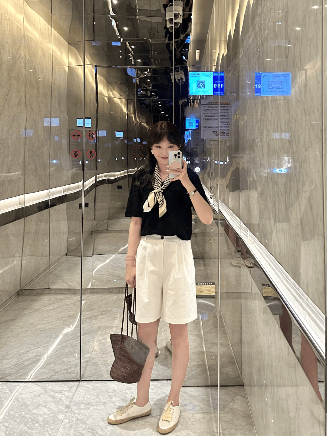 黑色T恤搭配西装短裤,利落又显气场,把T恤下摆塞进裤腰,瞬间拉高腰线、优化比例,整个人显得挺拔又精神。一条米色条纹丝巾轻轻点缀,打破纯黑的单调,增添温柔细节与精致感。整套黑白简约风,干练清爽不挑人,初夏穿显瘦又时髦,日常通勤或出街都很合适。