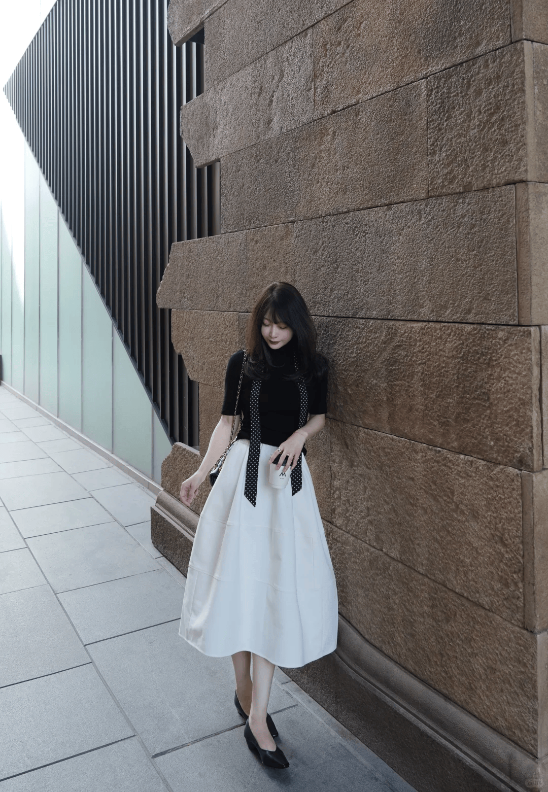 黑色背心搭配白色半身裙,简约又清爽。利落的背心凸显肩颈线条,高腰半身裙温柔遮肉,经典黑白配色高级耐看,初夏穿轻盈又显气质。